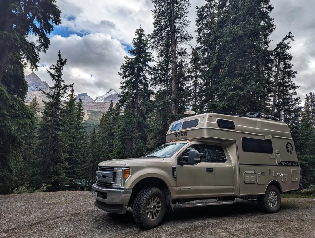 We bought our Tiger Bengal in 2015. Our previous RV was a Class B (camper van). What a difference! It is a pleasure having room to live inside when the weather is bad and being able to work beside each other when cooking. We no longer had to reassemble the bed when we were ready to sleep – another plus. In the time we have had the Tiger, we have traveled over 91,000 miles covering Newfoundland and the Canadian Maritimes, and 46 states in the U.S. In some of these places having four-wheel drive has been much needed. Covering these distances, we are reassured having a camper built on a truck chassis means we can find service wherever we are. We love it!